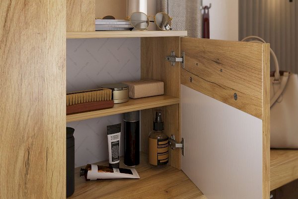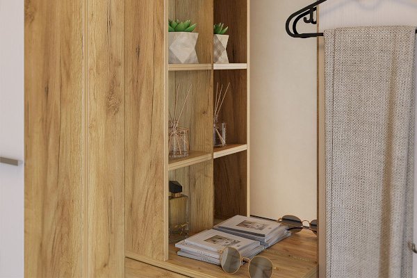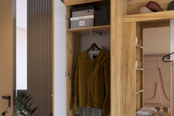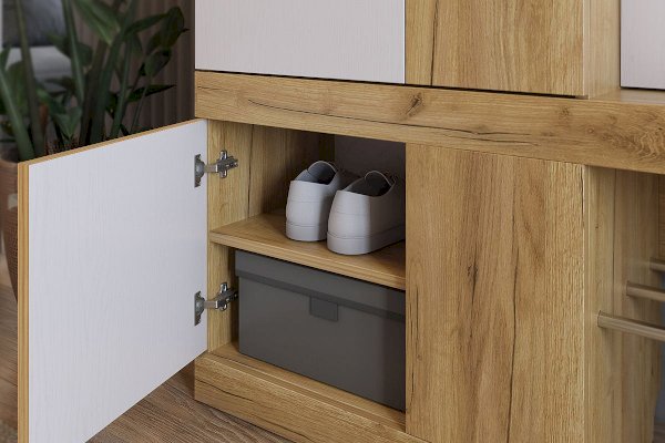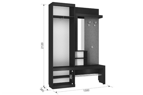«Алекс» - прихожая 3 в 1. Это открытые ниши для размещения одежды, сумок на металлические крючки и модное решение из хромированных трубок для хранения повседневной обуви. Закрытый шкаф-гардероб для несезонной обуви и верхней одежды на плечиках. А так же ниша-трюмо с зеркалом и полками сбоку станут незаменимыми помощниками в наведении утреннего марафета. В закрытом шкафу под зеркалом можно хранить средства для чистки обуви, фен и другие нужные вещи. Прихожая «Алекс» - в ней поместится ВСЕ и даже Больше!