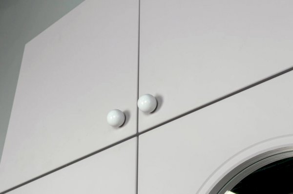 Корпус изготовлен из прочного ЛДСП толщиной 16 мм, фасады выполнены из МДФ в плёнке ПВХ. Гладкая поверхность фасадов придаёт мебели аккуратный и современный вид. Регулируемые навесы обеспечивают надёжное крепление и удобство установки.