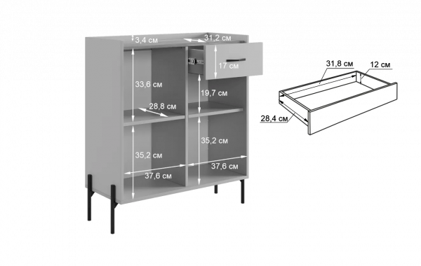 С другой стороны комод оборудован выкатным ящиком, который обеспечивает легкий доступ к часто используемым предметам. Под ним расположен большой глухой фасад, скрывающий за собой просторное хранилище для более крупных вещей.