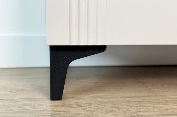 Дизайн комода продуман до мелочей: с одной стороны расположена стеклянная дверца, за которой находится просторное пространство для хранения. С другой стороны – ниша с открытой полкой, выкатной ящик и ещё одна глухая дверца, что позволяет гибко организовать хранение и поддерживать порядок в доме.